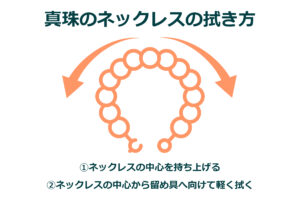 ⭐︎真珠のネックレスを拭く際は、「左端→中心→右端」のように片側方向へ向けて拭くのは、ネックレスに力がかかり糸の劣化を早めてしまうのでNG。中心から拭きはじめ、端に向かって「ゆっくり」「力を入れず」に「丁寧」に拭きあげます。