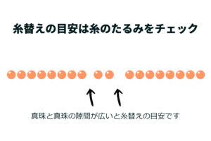 毎日使うわけではない真珠だからこそ、半年〜1年に1回くらいの確認が必要です。 特に季節の変わり目は気温の変化が出てきたり、湿度の変化も。 冠婚葬祭の使用については、結婚式の場合は予定を立てて行われるので、早めに真珠を点検し糸替えの必要がないかどうか確認しておくと安心ですね。葬儀の場合は、突然のことの方が多いからこそ、半年~1年に1回は点検をしておきましょう。