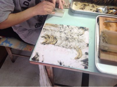 アコヤ貝へ細胞を挿入すると溶けてしまうそう 可視化するため赤い植物性色素を垂らし、小さくカットした状態