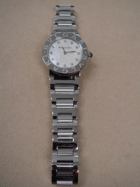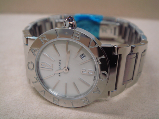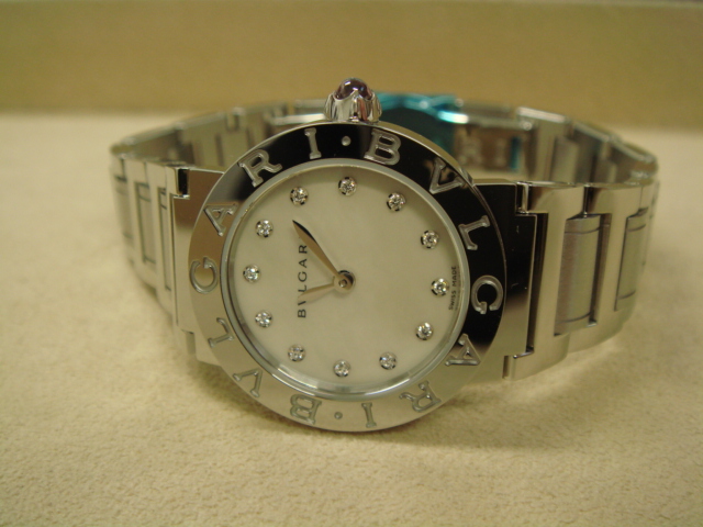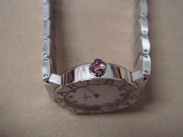 新作の「ブルガリ・ブルガリ」はダイヤルにマザー・オブ・パールを使用し、クラウンにはなんとピンクのカボションカットストーンが配されています。↑は¥399,000- と、なんとアンダー40万円!!!