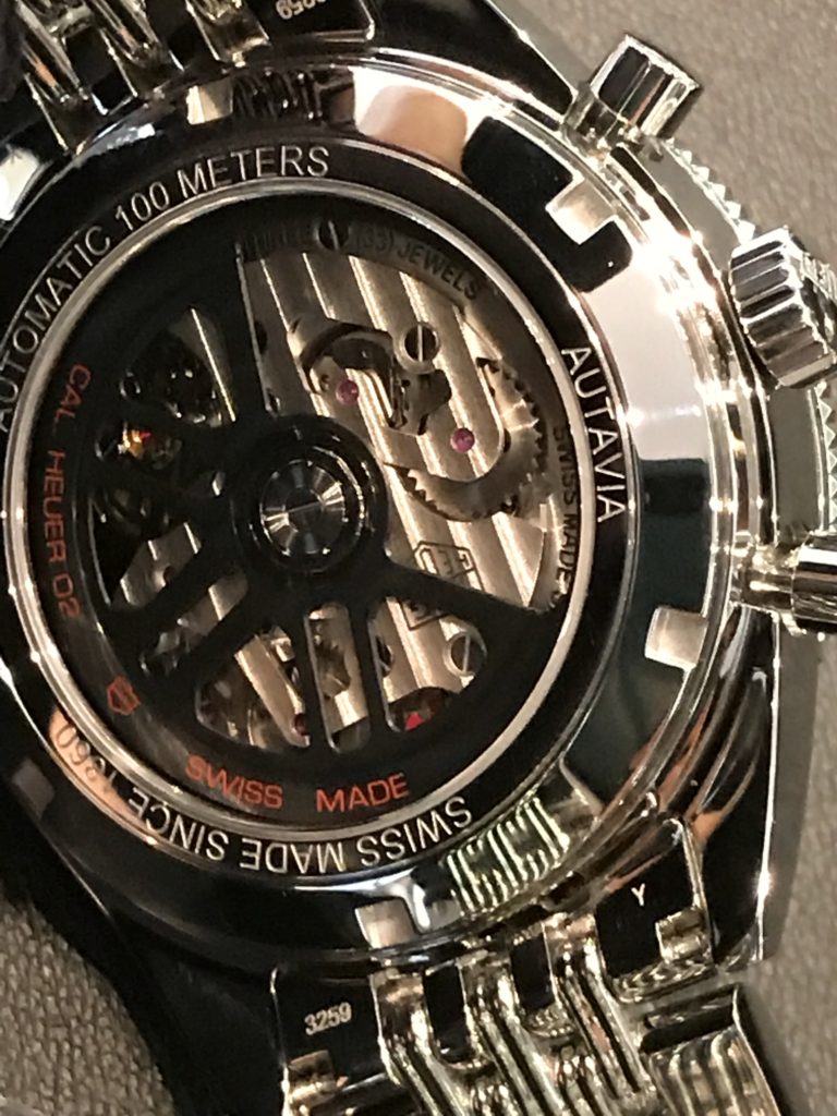 裏スケなので覗いてみると、そこには最新の自社ムーブメント「ホイヤー02」が!
