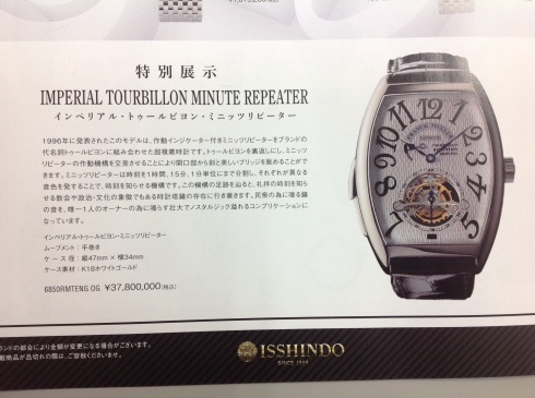 時計 半年に一度の時計の祭典 投稿者: 1sd 投稿日: 2015年1月25日 こんにちは。松本渚店の竹内です☺︎ 新年明けて、あっという間に1月も後半です。 月が変わって2月には、半年に一度のブランドウォッチのフェアを開催致します! ワールドウォッチフェア 2/14(土)〜2/16(月)の期間の開催です 当日は、10ブランド以上が一堂に会します 今回の注目商品はコチラ⤴︎ フランクミュラー「インペリアル・トゥールビヨン・ミニッツリピーター」 ¥37,800,000(税込み) 普段は目にすることができない特別品、 我々も今から楽しみにしています