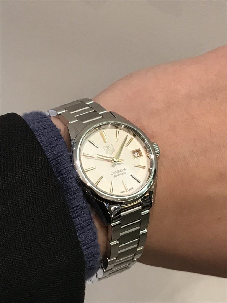 カレラはメンズ用のモデルがとても有名ですが、きちんとレディース用も考えられていて、着けた感じはちゃんとオシャレに見えるケース幅なんです。