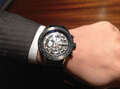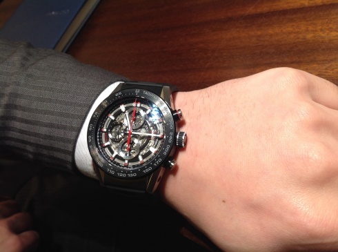 2015バーゼルレポート最新情報 タグホイヤー2015年 新作情報 投稿者: 1sd 投稿日: 2015年3月19日 タグホイヤーから新型ムーブメントの誕生です!その名も「HEUER 01」これまでのキャリバー1887ムーブメントの後続機!このムーブメントを搭載したのがこちら↓キャリバーホイヤー01 自動巻クロノグラフ ケースサイズ45mm ブラックスケルトンダイヤル 10気圧 パンチングレザーベルト ブラックスケルトンのムーブメントプレート 価格 550,000円税抜き