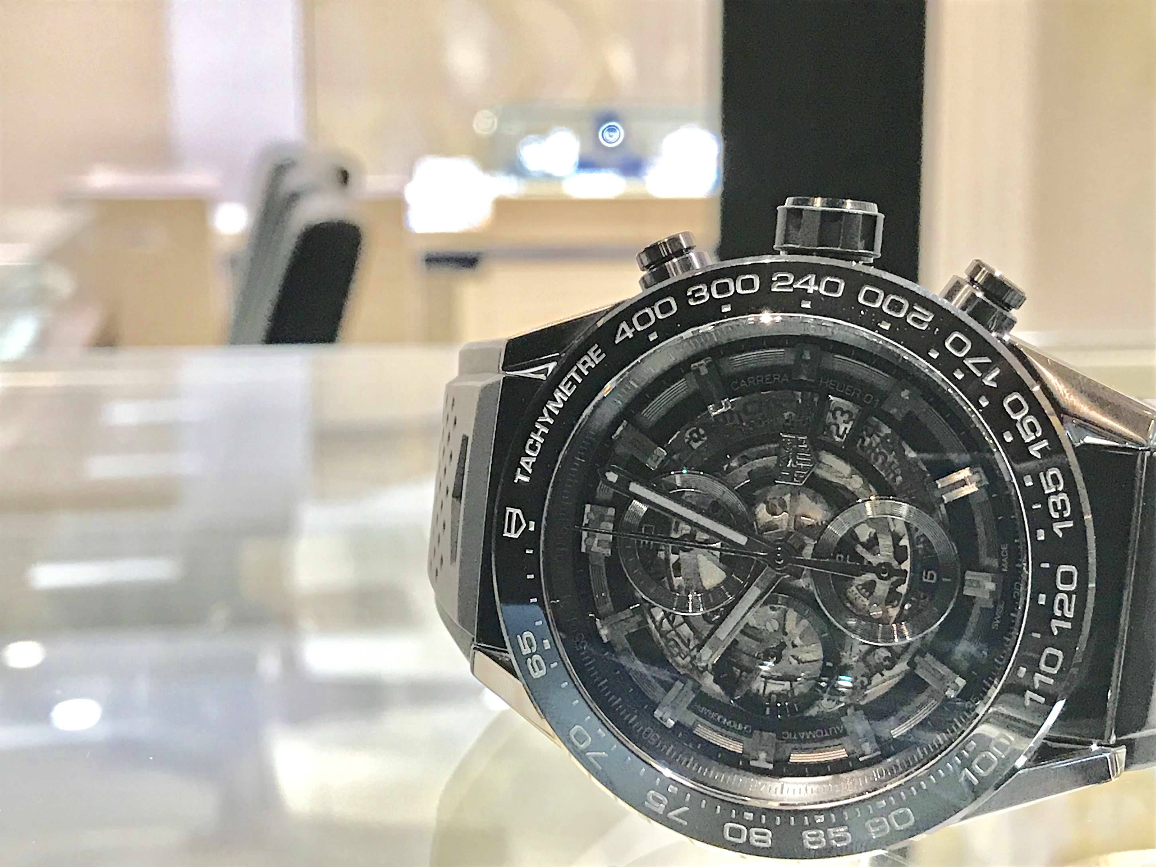 金属の光沢とセラミックの黒が車の内部を思わせるような、何ともタグ・ホイヤーらしい時計です(^^)/