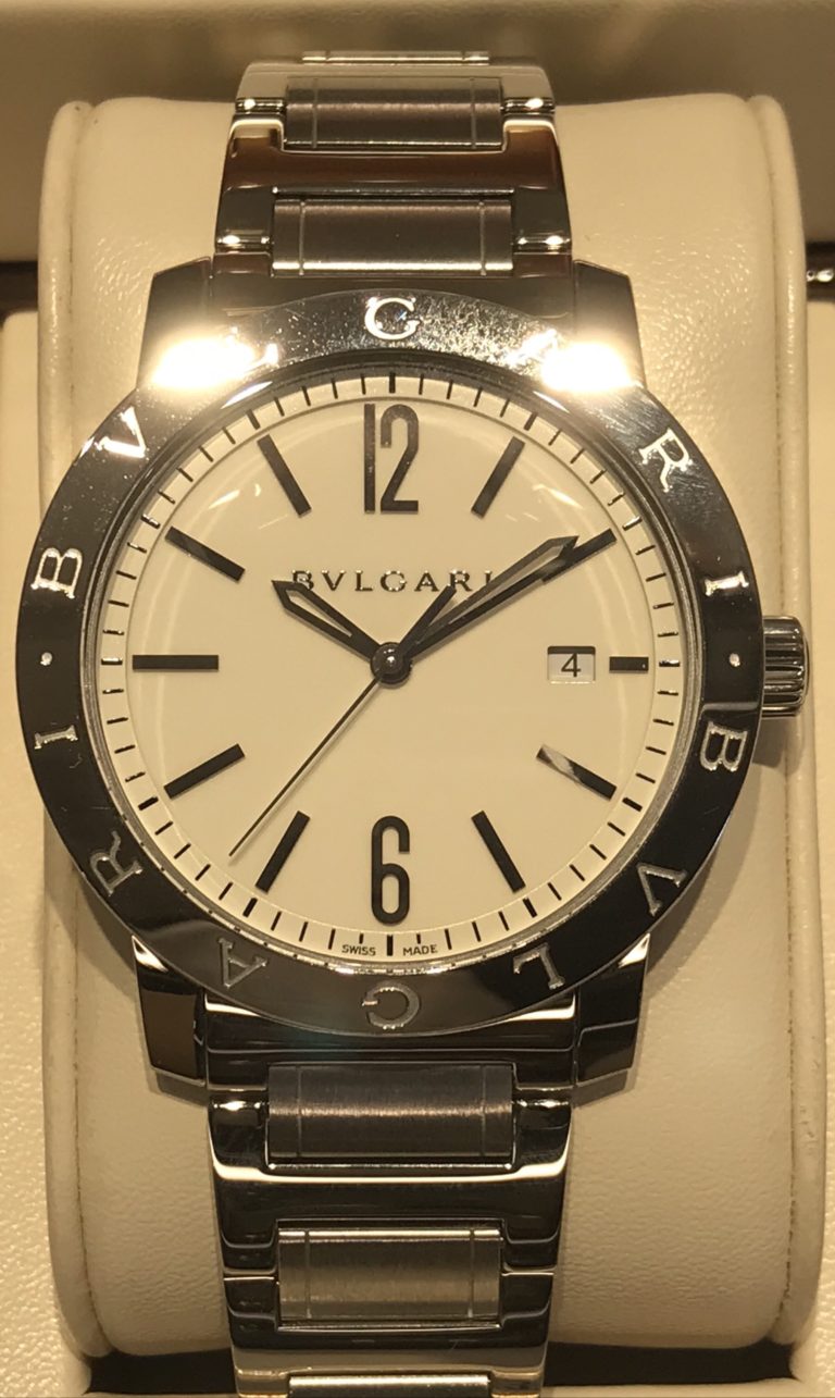 定番の白と黒の文字盤は、ブルガリの文字がしっかりと刻まれています!