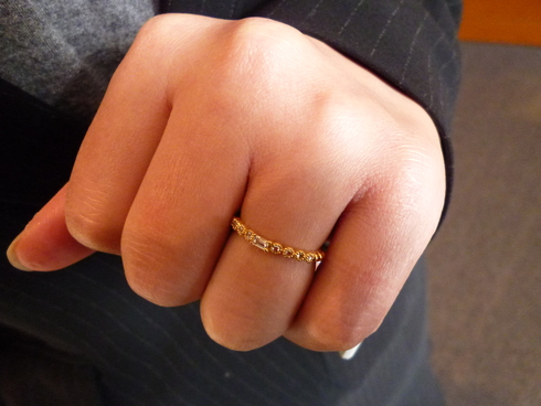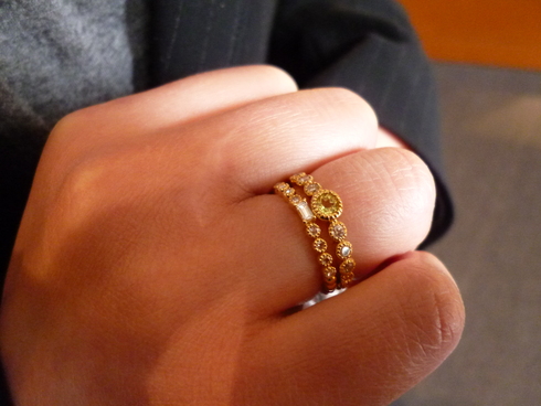 ミル打ちが施されたバゲットカットのリングは細身で重ね着けしても◎