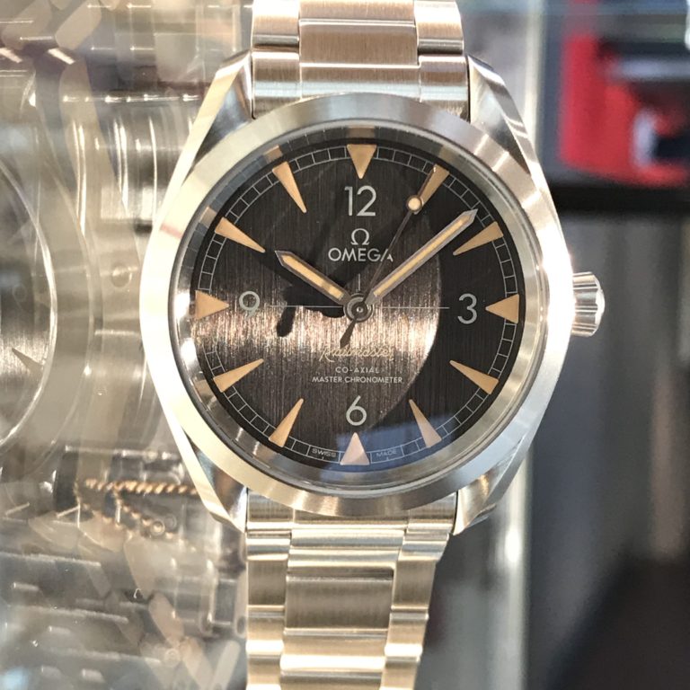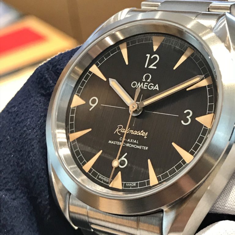 このレトロな色合と筆記体のレイルマスターの文字に、最新の文字盤加工技術の縦筋研磨が加わって、古くて新しい時計が誕生したのでした。中身はもちろんコーアクシャルですから、帯磁性能もばっちり!候補として、一度見てみるのも楽しいかもしれませんね!