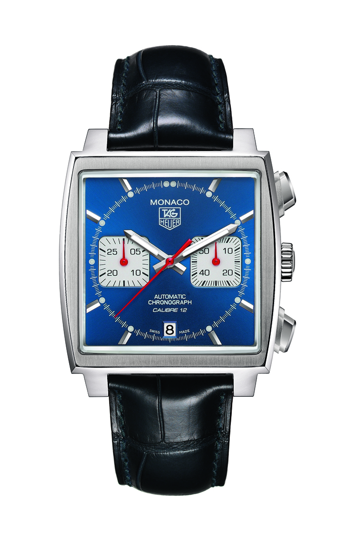 初代モナコの復刻版のモデル。初代の左リューズを再現するべく共同開発されたムーブメントが搭載されています。