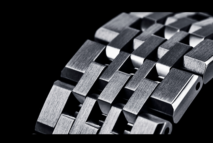 ケースと滑らかにつながる新開発のブレスレットは、鏡面仕上げとヘアライン仕上げのこまを短いピッチで組み合わせ、水平のラインが際立つデザイン。