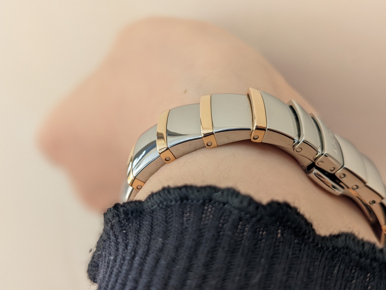 正面から見た表情も丁寧に磨き上げられ輝きのあるモデルですが、実はブレスレット部分にもブルガリならではのこだわりがあります。