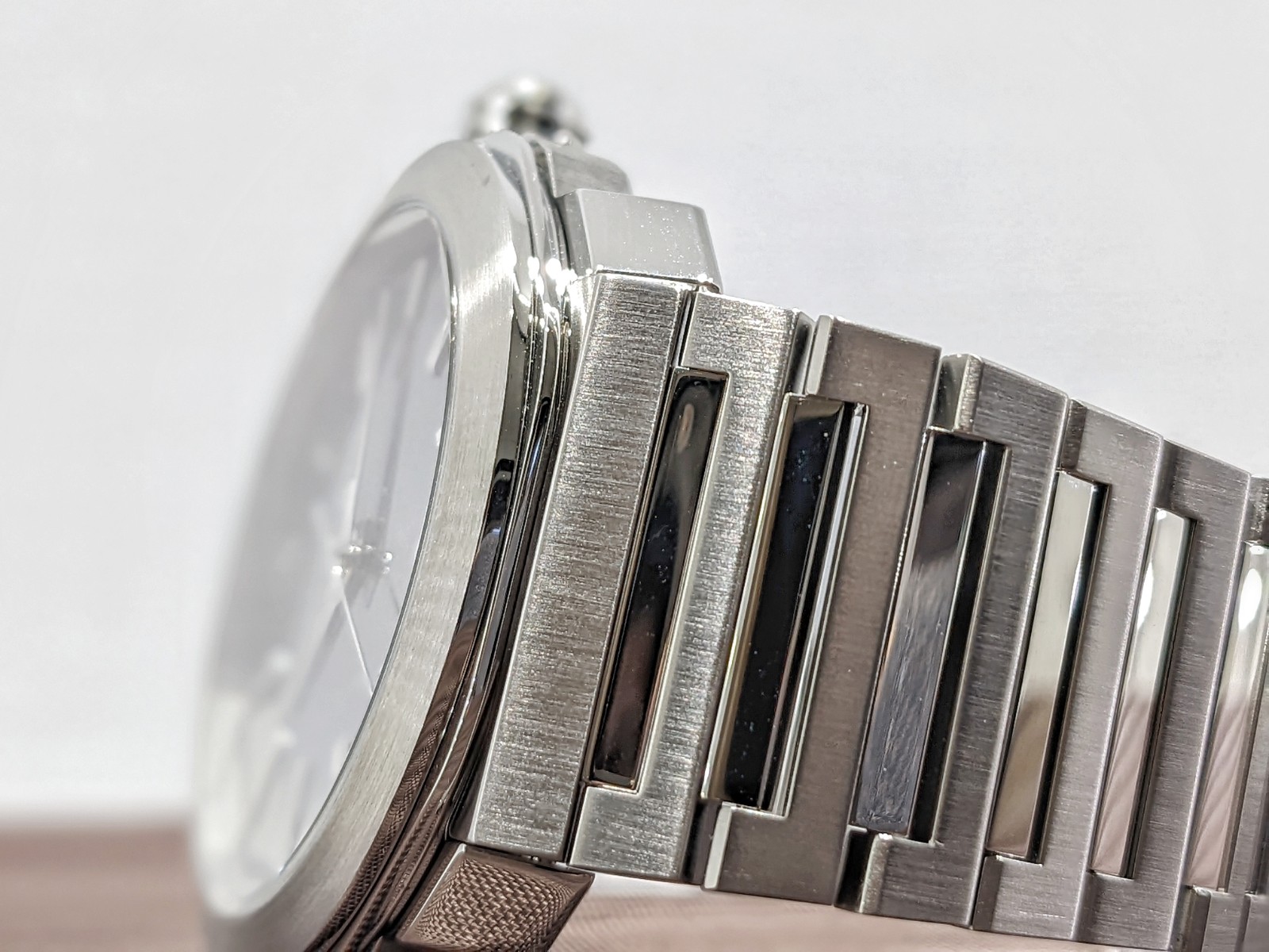 ポリッシュ仕上げとブラッシュ仕上げを交互に組み合わせた110のファセットからなるケース。