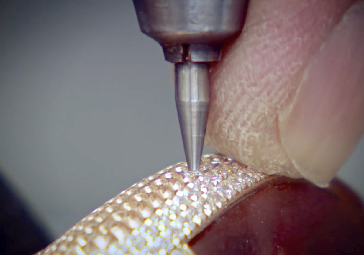 丸みのあるケースに、職人よる手作業で1つひとつ丁寧に留められていきます。