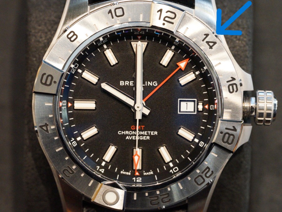 スイスと日本の時差は-8時間なので、スイスの現在は「14時(午後2時)」となります。 操作はシンプルです。GMT針が指している位置(3時位置)に、ベゼルの数字の「14」が来るように回してください。