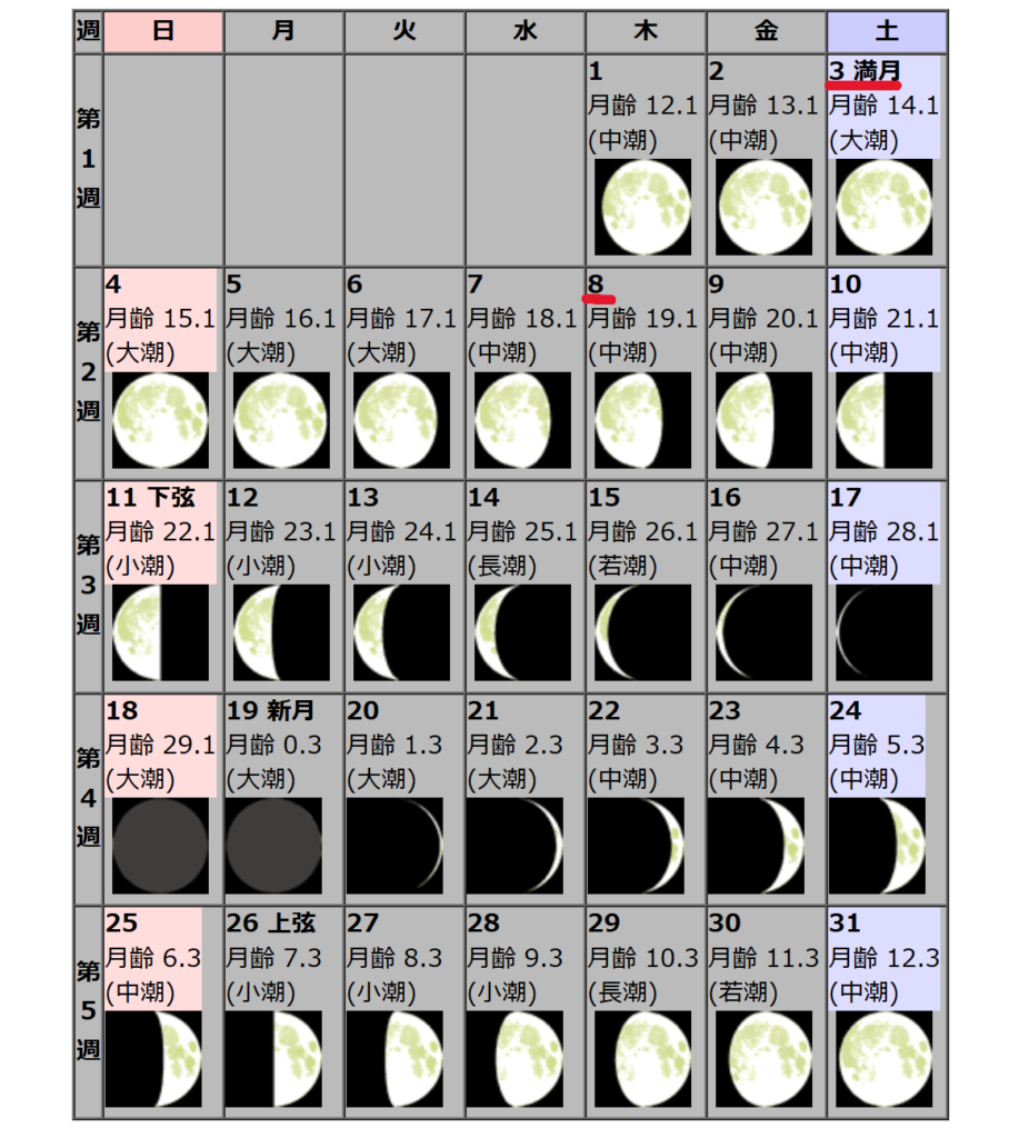 例:上記のカレンダーで今日が8日だった場合、満月(3日)から「5日経過している」となる