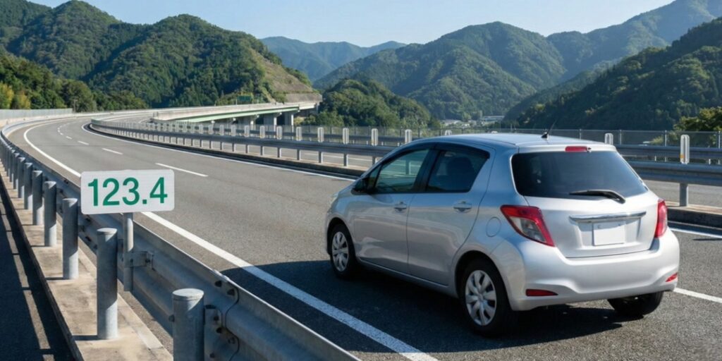 高速道路の距離標(キロポスト)などを利用し、1kmの区間移動を計測します。スタート地点でクロノグラフを作動させ、1km地点通過時に停止させます。