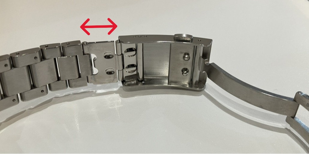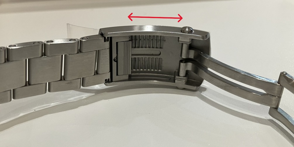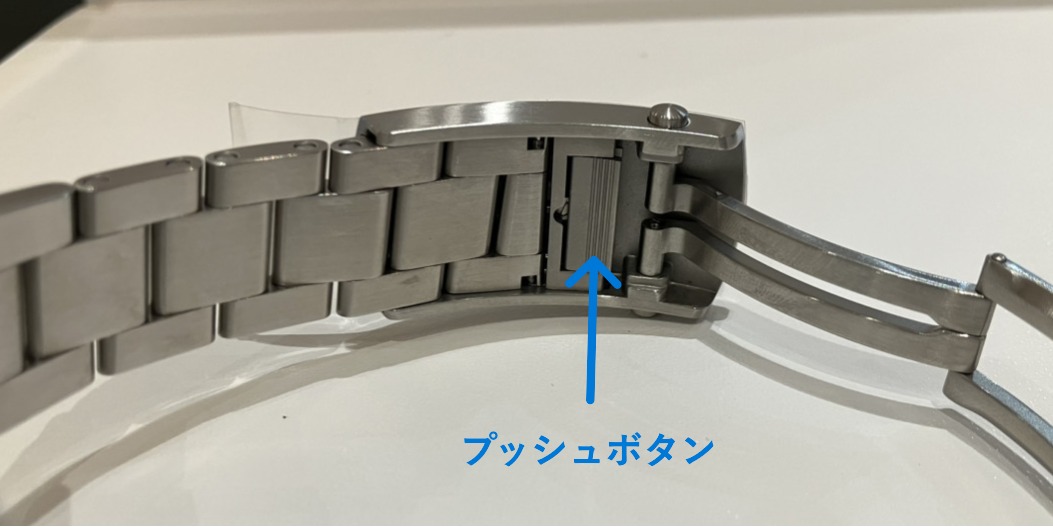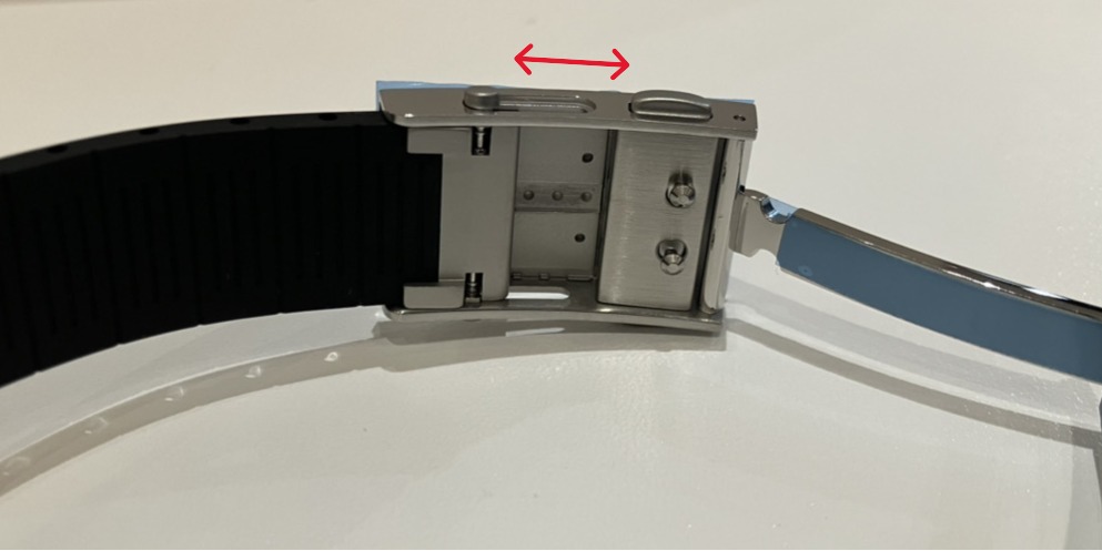 使い方: バックル側面にあるプッシュボタンを押す、あるいはバックル内部のロックを解除しながらブレスレットをスライドさせて調整します。