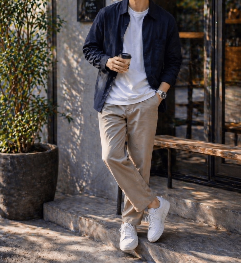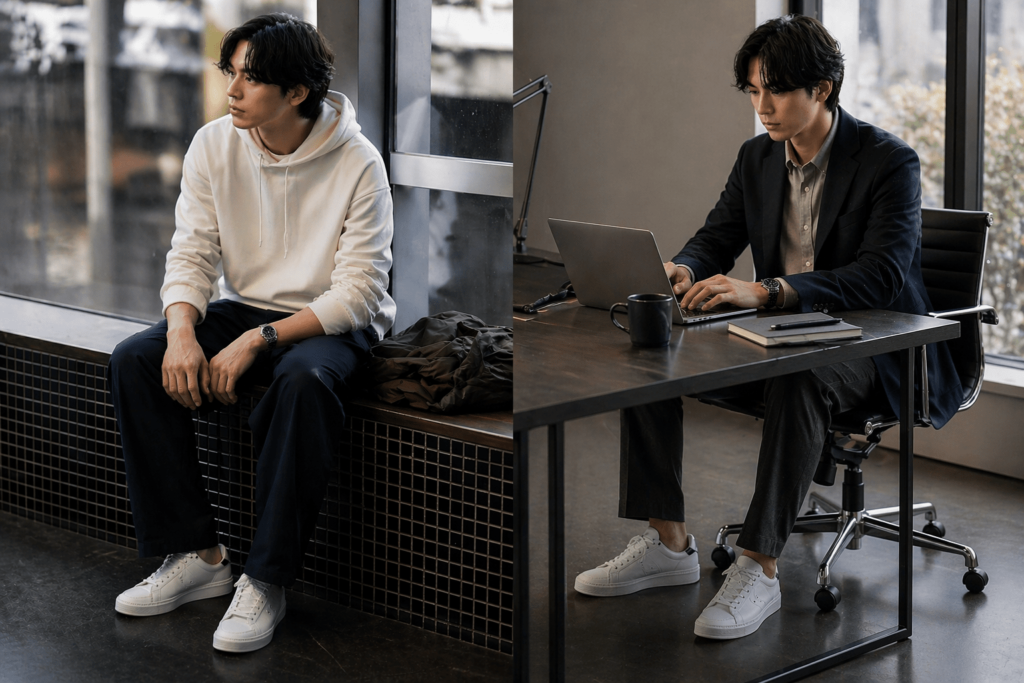 近年ではオフィスカジュアル化も進み、足元はレザースニーカーで合わせるスタイルが通勤シーンでも定番化しています。