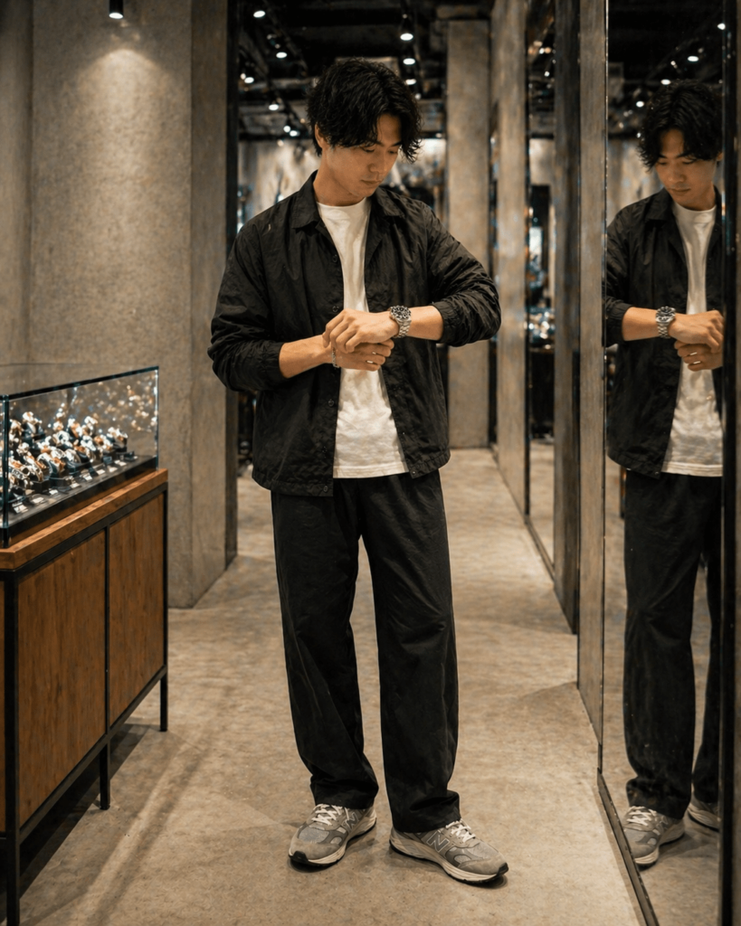 スニーカーで抜け感を演出しているからこそ、腕元は清潔感×高級感でまとめると好印象。