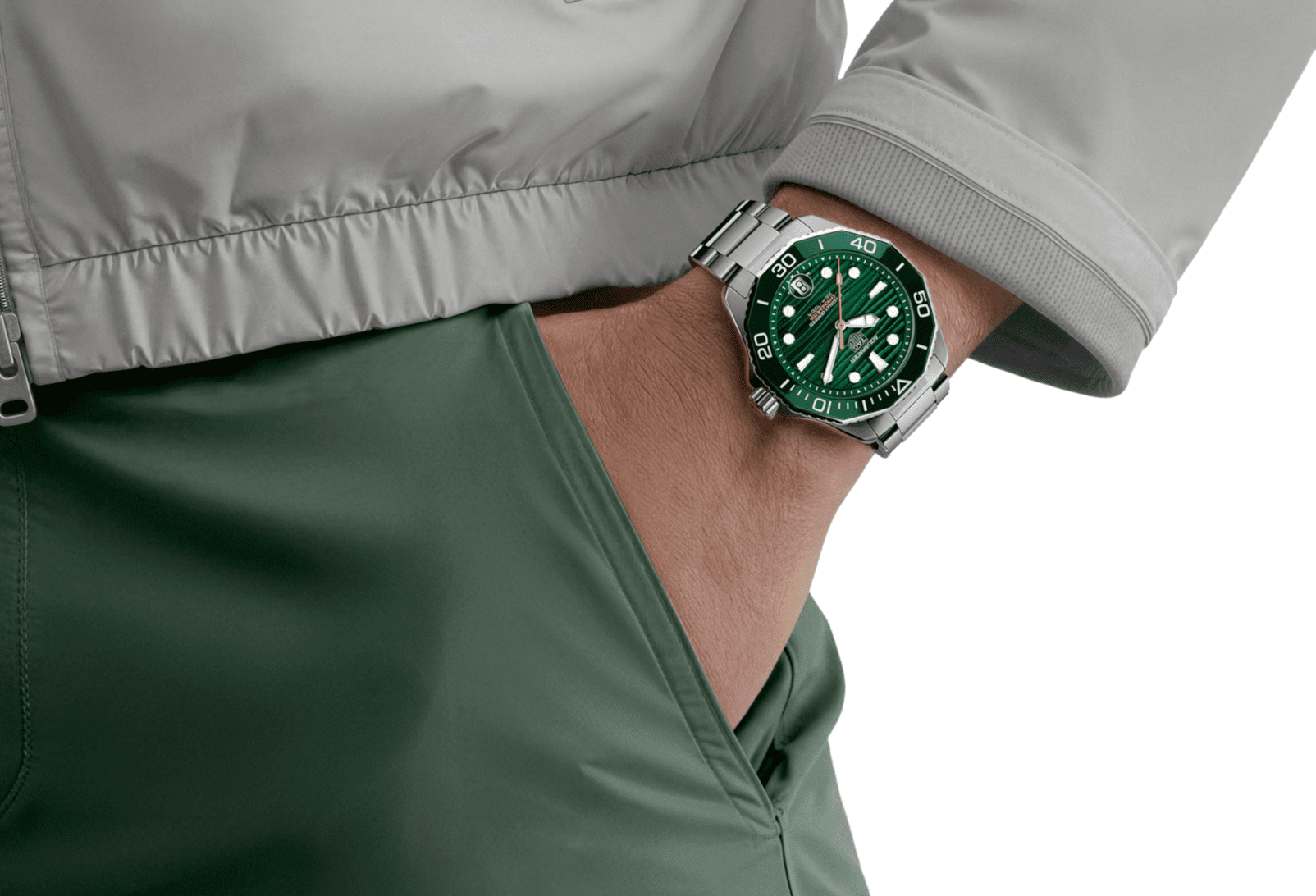 波模様の仕上げが施されたディープグリーン文字盤。海の神秘を思わせる鮮やかなライムグリーンの秒針が、高い視認性を実現しています。