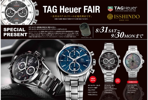 一真堂では8/31(土)~9/30(月)まで、飯田市かなえ本店・長野市ブルージュ店・松本市渚店にて「TAG Heuer FAIR」を開催中です