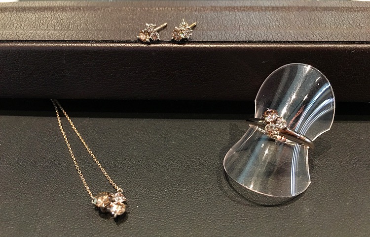 ダイヤモンドの大小や濃淡が異なる3粒が寄り添い合い煌めきます