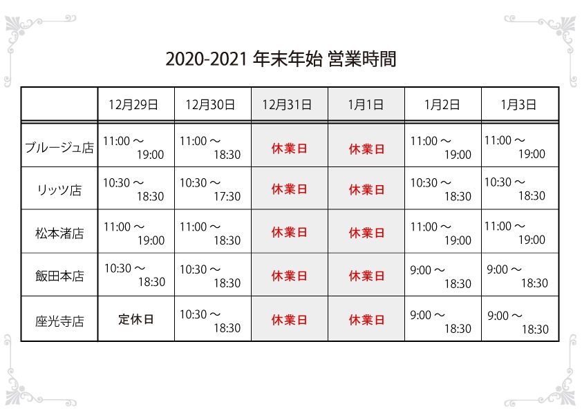 年末年始 営業時間のお知らせ