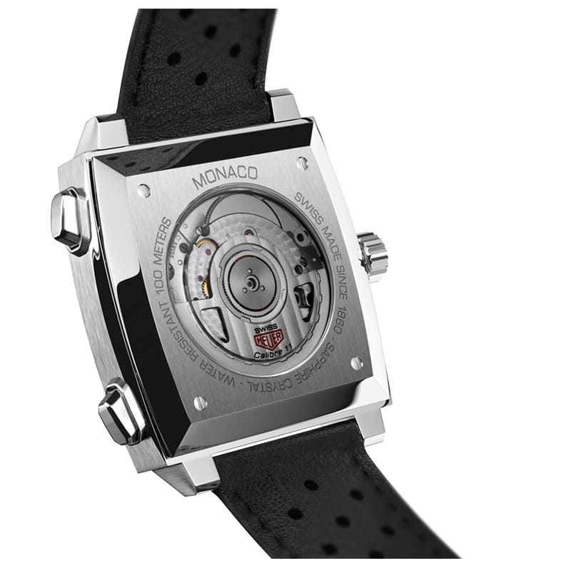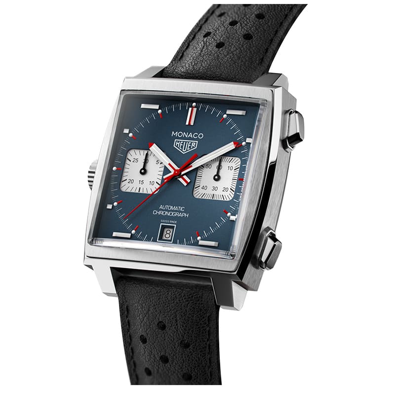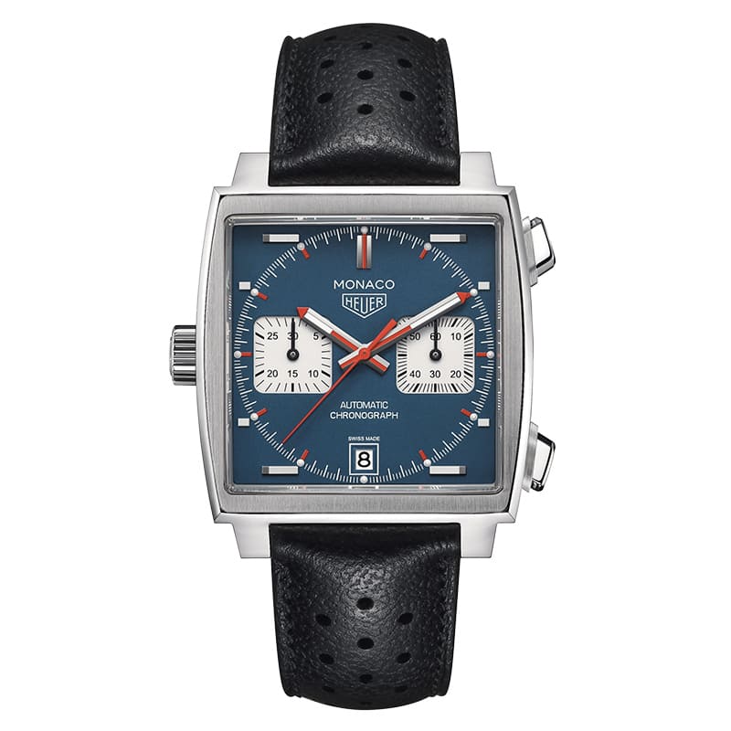 映画「栄光のル・マン」で、スティーブ・マックィーンに着用された「初代モナコ」。その伝説的なモデルを再現した本機は、ケース左サイドにセッティングされたリューズが特徴。ツヤを抑えたブルー文字盤には「HEUER」のヴィンテージロゴが印字され、オリジナルモデルをトリビュートした特別感を演出しています。