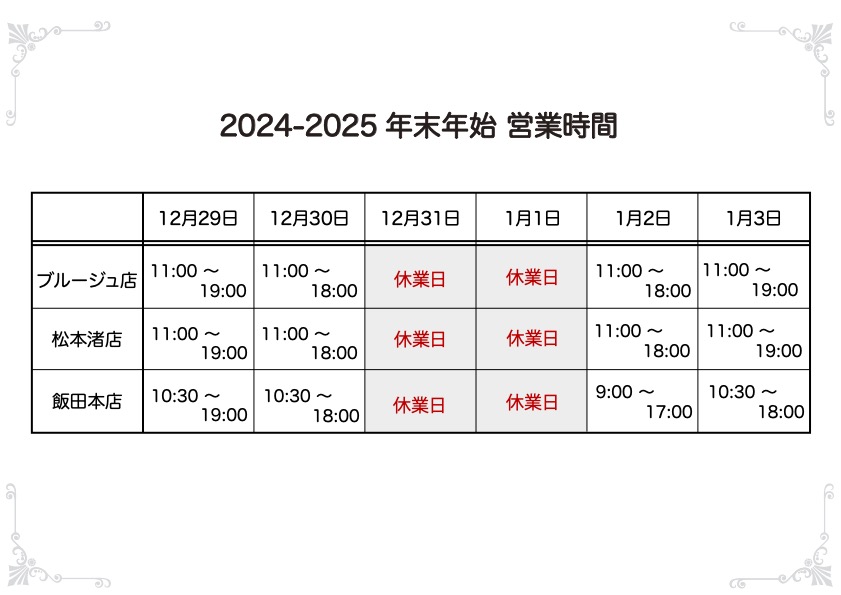 誠に勝手ながら年末年始の営業時間は、画像の通りとさせて頂きます。