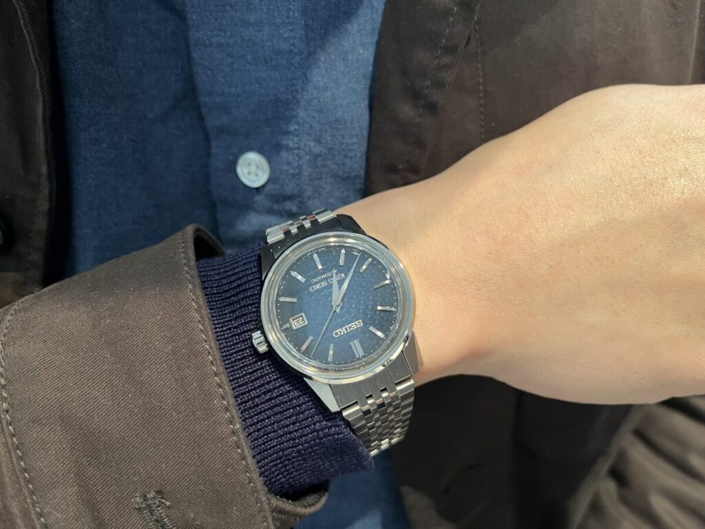 この度はブルージュ一真堂へご来店いただき誠にありがとうございます。お選びいただいたキングセイコーKSK「隅田川」モデルは、縁起の良い柄として継承されてきた日本の伝統的な亀甲文様のデザイン。文字盤のグラデーションがおしゃれで、男性様のクールな雰囲気にとてもお似合いでした。男性様が好きな色のブルー文字盤の時計をお選びいただいたので、より愛着を感じてお使いいただけると思います。また、クリーニング等でお気軽お越しください。